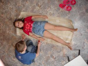 В полдень к нему пришли его друзья: девочка Оля пяти лет и четырёхлетний мальчик Дима. Мы с сыном заранее обсудили вопрос об угощении. Он сообщил мне, что «кушать долго — скучно», и мы ограничились соком, пирожными, бананами и яблоками. Всё это поставили на низенький столик, а стаканы и тарелки решили поставить пластмассовые, чтобы не переживать, что что-нибудь может разбиться.