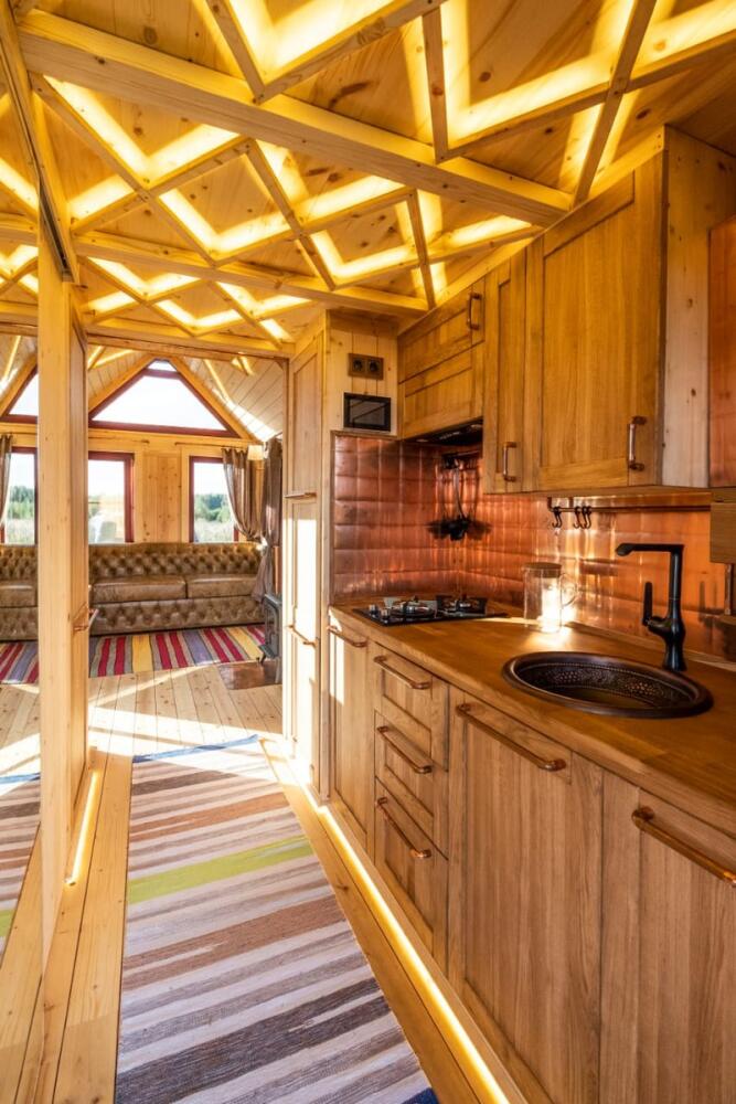 Внутри такой дом так же функционален, как и его «взрослый» аналог, просто комнаты и их обстановка значительно уменьшены, как и их оборудование. Конструкторы и дизайнеры при создании такого жилья учитывают и задействуют каждый квадратный сантиметр. Вместо привычной ванны оборудуется душевая кабина, спальное место располагают под потолком, крохотная кухня часто объединена с комнатой.