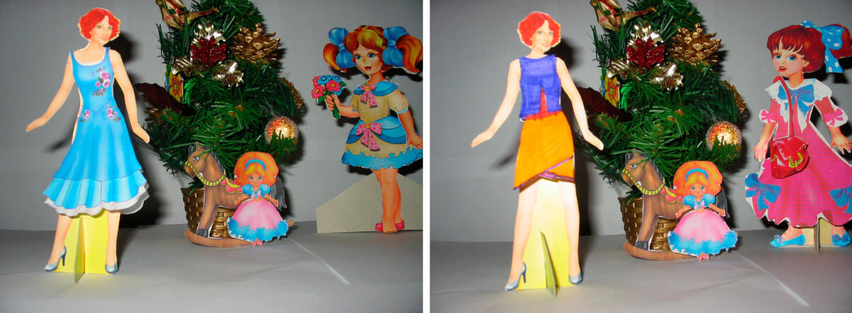 Приведу пример, как мы с внучкой в новогодние дни разнообразили, казалось бы, довольно одноразовую, скучную для повторения игру в одевание кукольных манекенов в бумажную одежду.