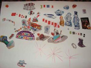 Итак, раскрашиваем наш календарный лист баллончиками с краской, желательно, чтобы краска была яркой, но не темной. Далее делим лист мысленно на три части: слева направо, сверху вниз, по диагонали — это уже как хотите. Теперь вырезаем из журнальных заголовков крупные буквы и составляем из них названия месяцев. Из газетных заголовков — числа. Приклеиваем всё это. Некоторые числа можно пропускать. Например, у вас день рождения 4 февраля — клеим цифры 1, 2, 3, затем приклеиваем вашу голову, вырезанную из фотографии, на голову приклеиваем вырезанную из журнала смешную шапочку или праздничный колпак и далее клеим уже цифру 5. То есть, четверку мы заменили вашим довольным личиком. Таким образом заполняем весь наш календарный лист, выбирая для всех праздников и памятных вам дней картинки из журнала. Вместо картинок можно приклеивать всё что угодно, я уже писала об этом выше.