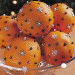 Эту идею я перед каждым Новым годом претворяю в жизнь. Так быстро, красиво и вкусно! Правда, не для нежных пальчиков. Я это делаю в перчатках. Беру красивую вазу. Апельсины. Сухую гвоздику. Не цветы. Пряность. Бутоны гвоздики должны быть ровные, не поломанные. Апельсины мою и насухо вытираю. Намечаю рисунок иголкой или шилом и через равные расстояния по этим линиям втыкаю остреньким уголком гвоздику.