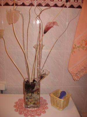Вазу и цветы покупала, а композицию, конечно, сама... Салфетку сама вязала. Фотка обрезанная - не все видно - длинные цветы.