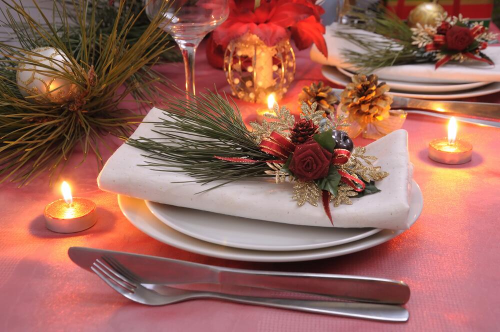 Декорируем стол. Отлично смотрятся в середине стола композиции из еловых веток и шишек, украшенных летами, игрушками и гирляндами. Вот где полёт фантазии! Привлеките к этому действу детей — праздник будет по-настоящему семейным.