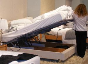 Есть кровати в стиле «Готы». Ну, все черное! За малым исключением. Есть интересные кровати: сдвоенные (не двуспальные), каждая половина поднимается электроприводом, под каждой половиной есть ящик. Я так думаю, это для женщин, у которых есть любовники. Пришел не вовремя очередной — поднимается матрац, а любовника туда, на хранение, в ящик. И пусть себе лежит смирно. Может даже поспать. А если, на беду, еще кто-то заявился (например, муж), то для второго — другой такой же отсек. И главное — они друг друга не видят и друг о друге не знают.