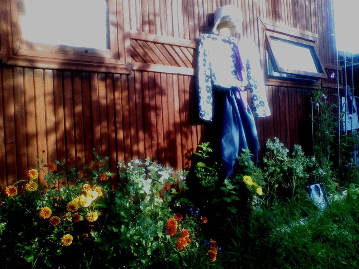 ( а внучок у меня иногда обижается и меняется рубашками с чучелом-мальчиком, прямо на огороде,решив, что у того красивше...) А башмаки, туфли, сапоги я набиваю землей и сажу меленькие цветочки- и гуляют у меня ботиночки по всему участку, под кустами, в теплице, вдоль тропинок....