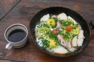 Я люблю такую яичницу жарить на даче. Там всегда времени не хватает, особенно если один. И зелень всегда под руками.