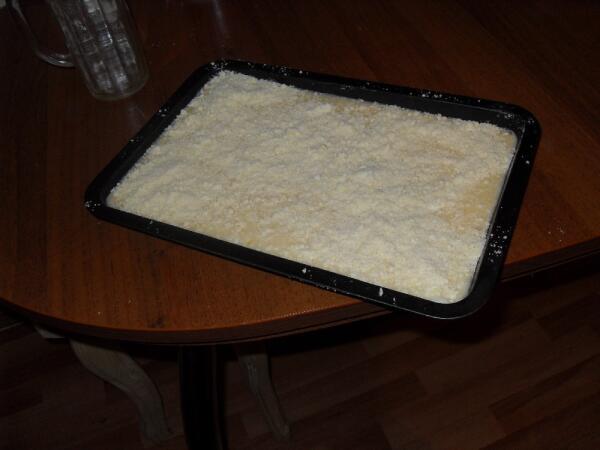 Крошка. Стакан муки и полпачки масла. Если хотите побольше крошки – значит, всего побольше. Растирается в секунды. Посыпается дно (большей частью). К сожалению, была свободна только маленькая посудина. Льется сверху смесь и присыпается сверху остатками крошки. Духовку поставила на 200. Через 35 минут все было готово. Очень простенько и очень быстро.