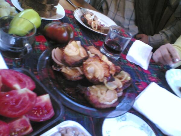 Мясо — не важно, в свежем или замороженном виде — режем кусками такого размера, чтобы их сразу можно было кушать, посыпаем крупно резанным луком или мелкими луковицами, сдабриваем чуть-чуть пряностями. Кому не хочется резать, можно запекать и крупными кусками, а потом порезать. Если мясо свежее, оно должно быть обязательно жирным, иначе получится суховатым. Солим в готовом виде. Ставим противень в жаровню, жаровню закрываем крышкой — и на огонь.