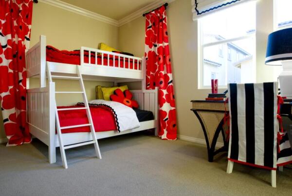 Нижняя зона — «зона игр». Для мальчишки здесь можно обустроить мини-спортзал. А для девочки сделайте акцент на уютность и женственность. Поставьте маленький столик и компактные кресла. Девочка с большим удовольствием будет встречать здесь своих подружек, чувствуя себя полноправной хозяйкой уютного салона. Важно не загромождать эту часть комнаты мебелью. Напольное покрытие должно быть утепленным. Поищите покрытие с интересным рисунком, например, футбольное поле, деревья с домами, цветущий сад или город с дорогами.