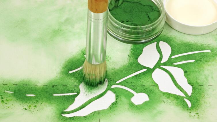 Для создания трафаретной росписи обычно используют акриловые краски. Они практичные, стойкие и нетоксичные. Иногда применяют акриловую пасту или мелкозернистую декоративную штукатурку. Такие материалы позволяют получить объемную форму росписи, похожую на барельеф.