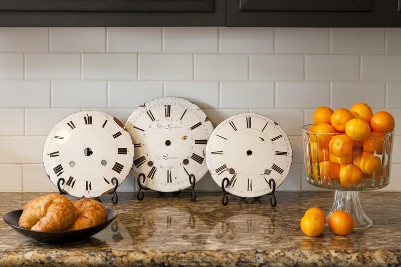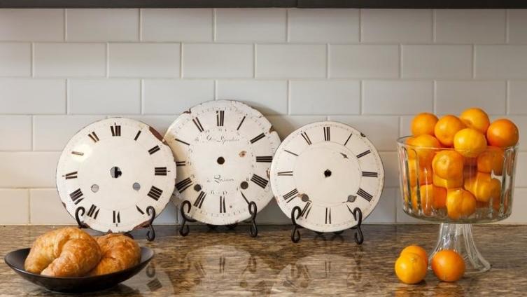 Во все времена кухню украшали посудой. Выставлять напоказ все сервизы, которые есть в доме, разумеется, не стоит. Декоративные тарелки, керамические заварочные кружки и миниатюрные чайники легко разместятся даже на самой маленькой кухне. Конечно, все детали должны гармонировать друг с другом. Если кухня оформлена в стиле «кантри», то для контраста будет достаточно современной бытовой техники, а часы, кухонные весы, кашпо для цветов и другие «мелочи» лучше подобрать в том же стиле, что и мебель, и текстиль.