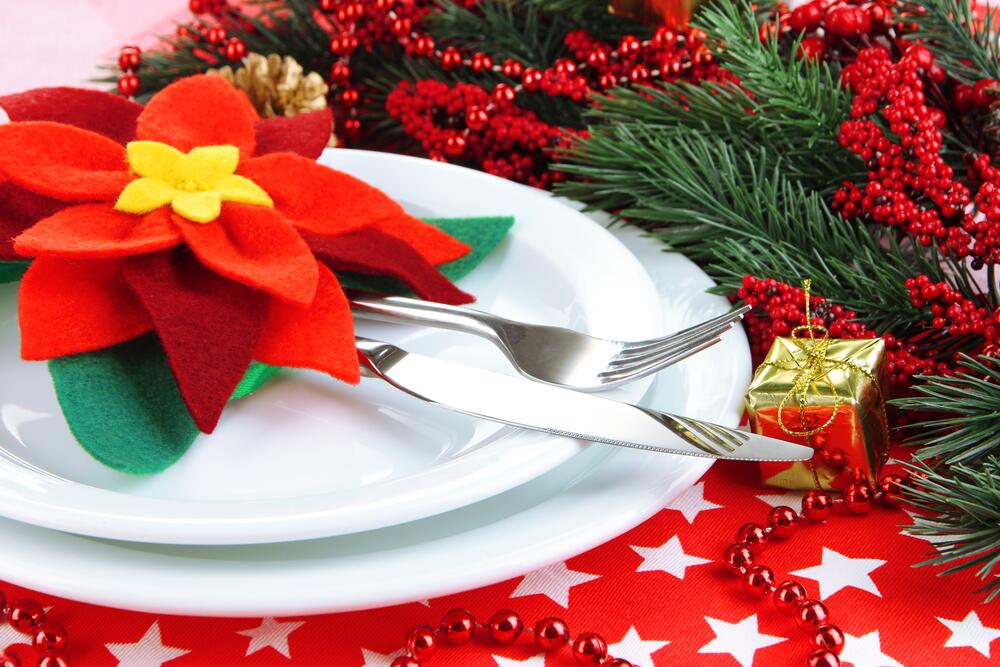 С чего начинается сервировка стола? Конечно, со скатерти. Торжественная — белая. Можно использовать и цветные однотонные скатерти. Красиво смотрится посуда и столовые приборы на красной скатерти. Это общие рекомендации, а оформление стола зависит от вашего вкуса. В принципе, можно постелить и «рогожку», она вполне гармонирует с елкой, еловыми ветками и глиняной посудой.