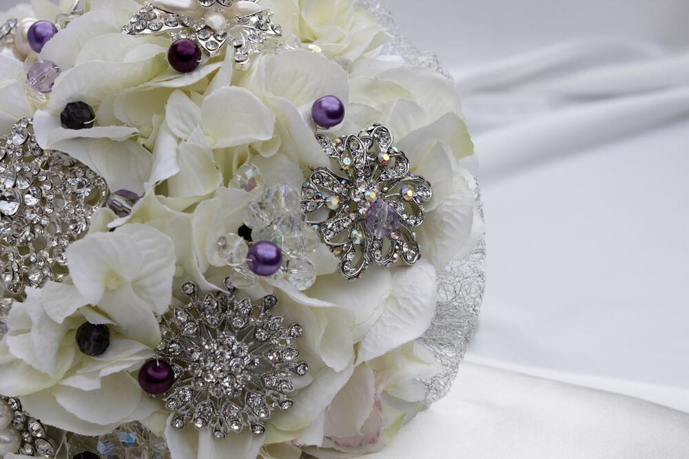 Свадебный букет из брошей наиболее гармонично будет смотреться на винтажной свадьбе. Броши могут быть дополнены разноцветными лентами, тканями, перьями или живыми цветами. Первый такой букет был создан в США.