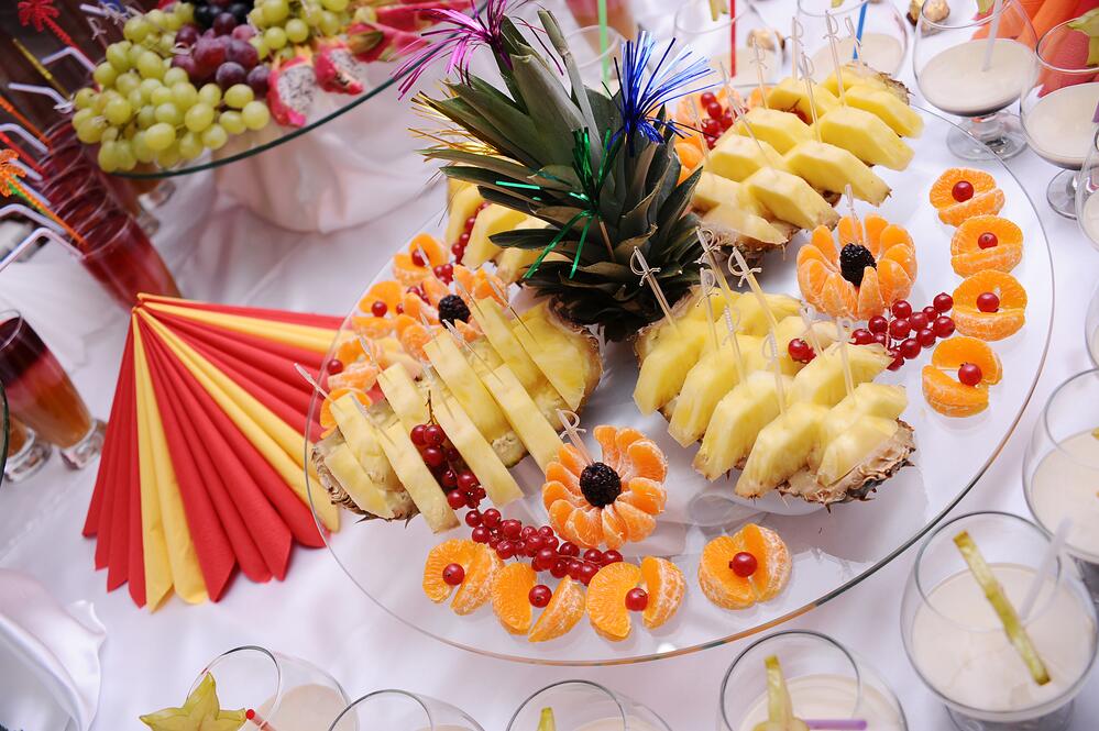 Выбор фруктов обычно зависит от времени года, хотя в наше время можно купить любые фрукты в любой сезон. Эффектнее всего на праздничном столе смотрятся апельсины, ананасы, крупный виноград, нектарины, абрикосы, киви, дыни. Не рекомендуются яблоки и бананы — они очень быстро темнеют.