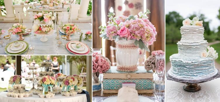 Шебби-шик, или винтажный стиль: для него характерна подчеркнутая состаренность, «патина». Атмосфера такой свадьбы должна воссоздать тихий уют и легкую романтическую атмосферу старинного «бабушкиного дома». В палитре лучше всего использовать пастельные тона — кремовый, бежевый, нежно-розовый, светло-голубой.