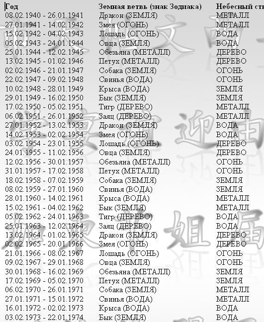 Дело в том, что любая единица времени также сопоставлена с так называемой Земной ветвью (знак гороскопа) и Небесным стволом (стихия). Дело осложняется еще и тем, что не последнее влияние на характер человека оказывают так называемые родственные связи. Нет, ваши предки тут ни при чем. Имеются в виду родственники-соседи вашего знака.