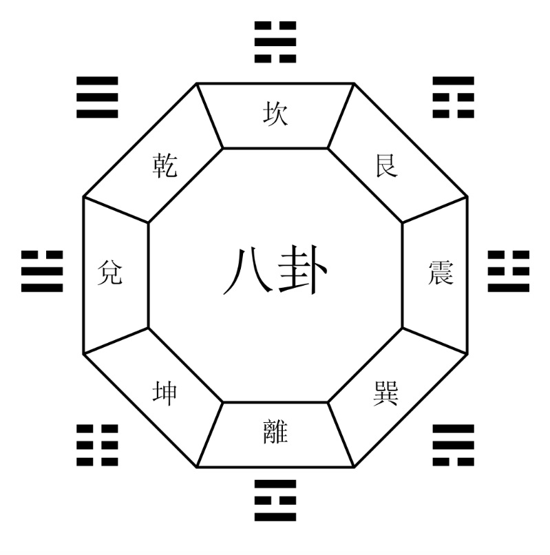 По легенде, один из придворных императора Фу Си увидел, как из реки Ло выплыла гигантская черная черепаха, на панцире которой были изображены загадочные знаки. Их скопировали, и стало видно, что они имеют определенную систему. Прерывающиеся и сплошные линии составляли символы, названные триграммами, и все они отличались друг от друга. Знаков было восемь, и со временем овальный панцирь черепахи начали изображать как восьмигранник, на китайском — багуа. На каждой грани восьмигранника расположен один символ. Каждый символ-триграмма соответствовал своей стороне света и стихии.
