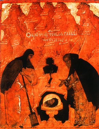 Первое обретение святыни произошло в период правления равноапостольного царя Константина. Явление увидели два инока, пришедшие с Востока преклонить колени перед Крестом Господним. Сам Иоанн показал им место, где была спрятана его голова.