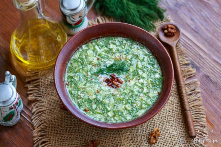 5. Таратор. Это болгарская окрошка на кислом молоке вместо кваса. Вливаешь кисело мляко, добавляешь воды, солишь, перчишь и строгаешь огурчика свежего туда. На терке я натираю огурец, добавляю немного оливкового масла и все перемешиваю. Такой холодный суп и вкусен, и полезен всегда, в любое время года.