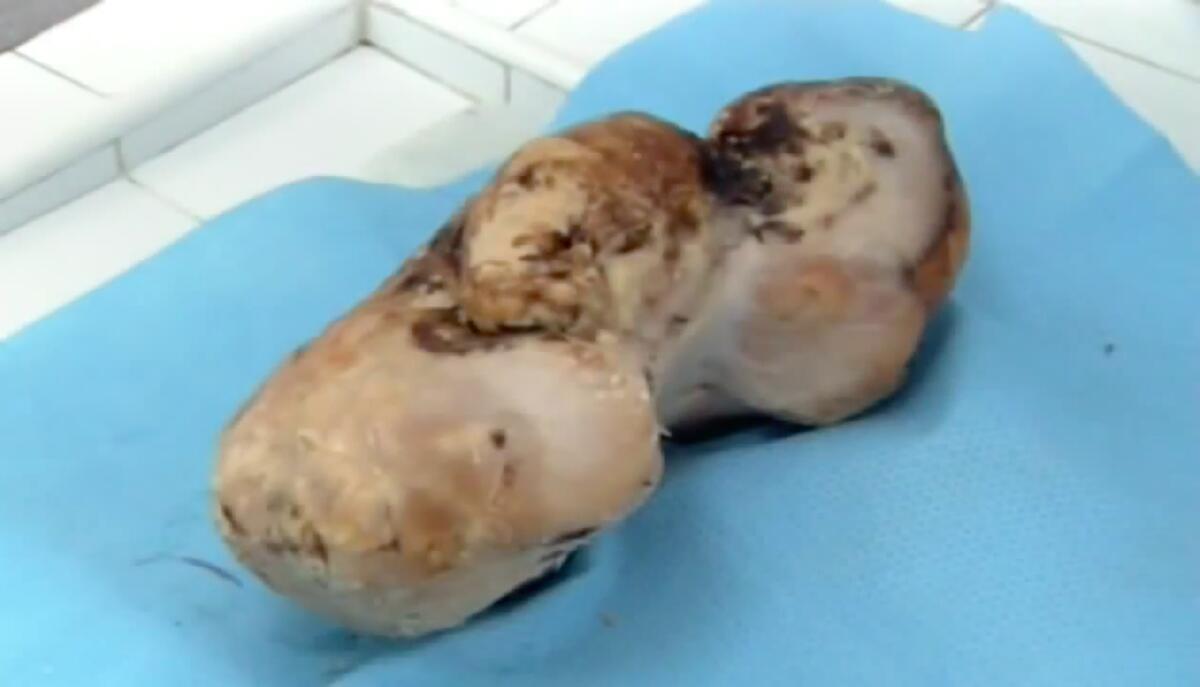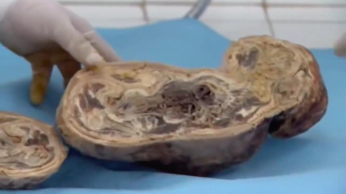 Спустя два года девушка вновь забеременела и в срок родила здоровую девочку. Первенец же ее появился на свет лишь 40 лет спустя. Она поступила в больницу с жалобами на острую боль и тяжесть внизу живота, расстройство мочеиспускания. В ходе предварительного осмотра в нижней части живота было обнаружено образование, твердое на ощупь и подвижное. Врачи сделали предположение, что это могла быть злокачественная опухоль. В ходе операции был обнаружен окаменелый плод.