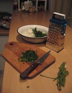 Или очень мне нравится салат, который я называю «Зелёным». Пачка хорошего творога стандартной жирности. Не сухого. И — равное творогу по весу (200 г) количество зелени. Четверть из которой — лук-перо. Остальное — делим поровну между укропом и петрушкой. Зелень мелко-мелко-мелко режем и хорошо вымешиваем с творогом. После чего берём зубчик чеснока, режем его помельче, а потом ещё и давим.