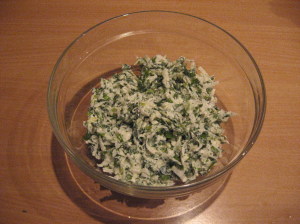 К вот этому резано-рублено-давленному зубчику потихоньку подмешиваем столовую ложку льняного масла. Как заправка готова — её в творожно-зелёную массу. И ещё разик — вымешать. Ну, а после этого — по тарелкам.