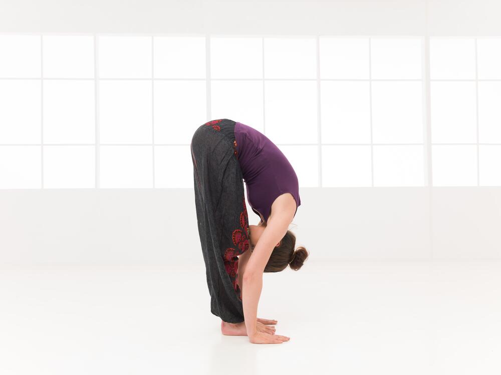 Держа ноги вместе или на ширине плеч (кому как удобно), поднимите руки через стороны вверх. Приподнявшись на носки и растянув всё тело, в этом растянутом положении наклонитесь и положите ладони на пол. Когда коснётесь пола, ступни можно полностью поставить на пол.