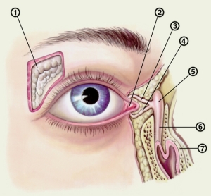 Слезная железа лежит в ямке слезной железы под верхним краем орбиты у наружного угла глаза. Она состоит из долек. Выводные протоки слезной железы открываются в верхний свод конъюнктивы (под верхним веком у наружного угла глаза). По слезному ручейку (желобок вдоль внутреннего края нижнего века, между ним и глазным яблоком) слеза поступает в слезное озеро – у внутреннего угла глаза. В области внутреннего угла глаза на верхнем и нижнем веке имеются выступы – слезные сосочки. На вершине слезных сосочков находится слезная точка.