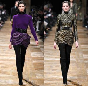 Для вечернего выхода необычайно хороши также драпированные юбки-тюльпаны из богатых тканей — например, бархата. Balmain видит их в сочетании с облегающим верхом того же тона.