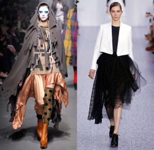 Весьма оригинальны юбки с асимметричным подолом, играющие длиной от мини до макси, разнообразных объемов и тканей — плиссированные, с многослойными нижними юбками из сетки, с рваным краем…