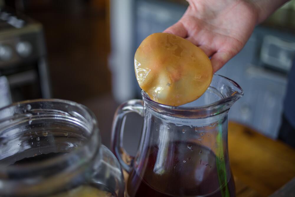После этого гриб нужно промыть чистой водой, перенести его в трехлитровую банку и залить холодной чайной заваркой с сахаром. Можно настаивать его на черном или зеленом чае, но обязательно добавлять сахар. Сахар способствует процессу молочнокислого брожения и росту грибка.