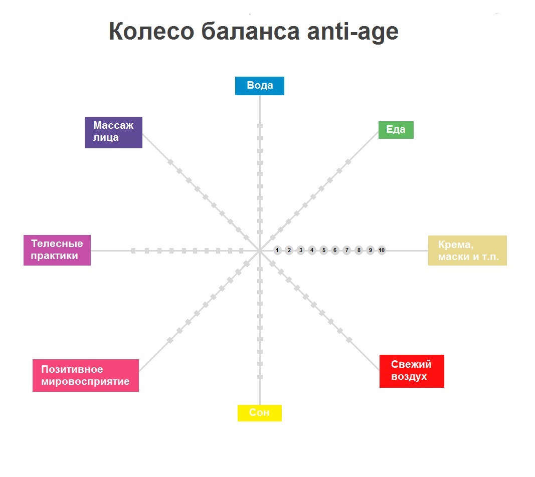 А теперь о самих параметрах. Свою anti-age стратегию я бы назвала «экологичная результативность». Именно поэтому, например, в колесе баланса anti-age нет уколов красоты, зато есть массаж лица. Основная часть параметров — это классические общие рекомендации, о которых вроде бы все знают, но часто бывает так, что их либо не выполняют, либо выполняют, только получают не тот результат. Потому что важно не только что, но и как делать.