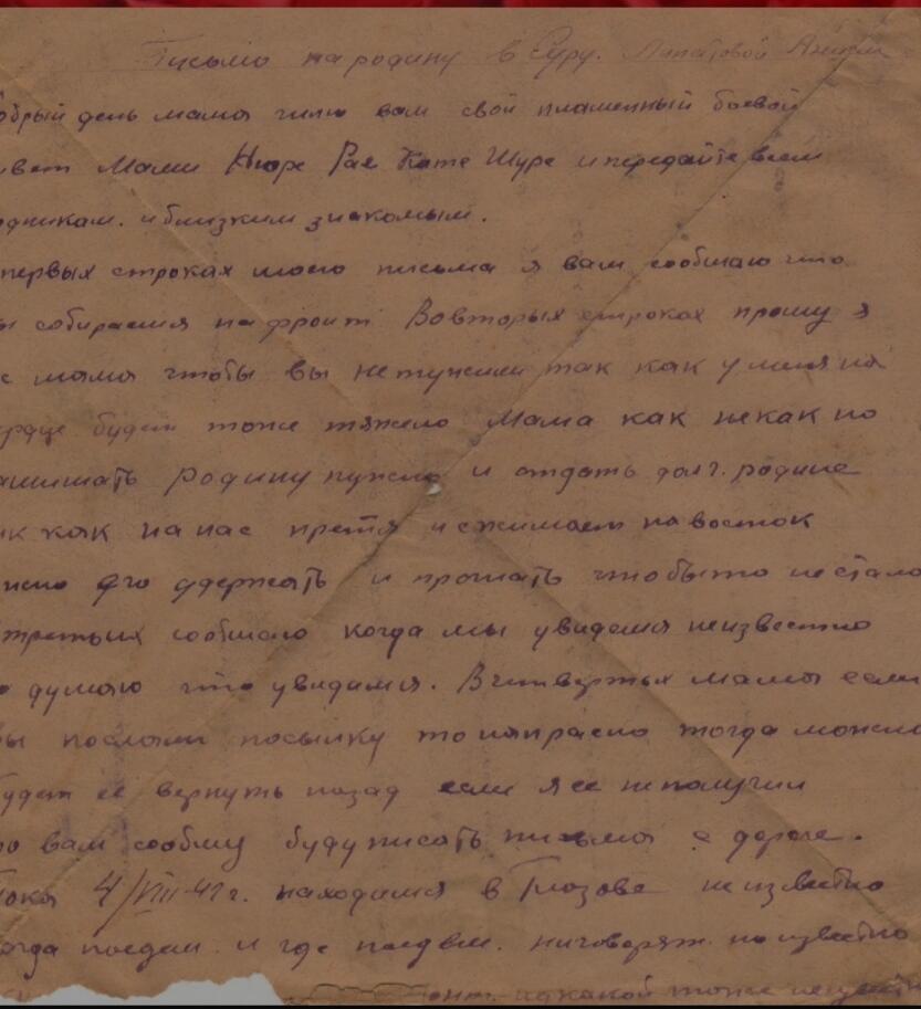 …Во вторых строках прошу я вас, мама, чтобы вы не тужили, т.к. у меня на сердце будет тоже тяжело. Мама! Как никак, позащищать родину нужно и отдать ей долг, т.к. на нас враг прётся и сжимает на восток, нужно его сдержать и прогнать во что бы то ни стало…
