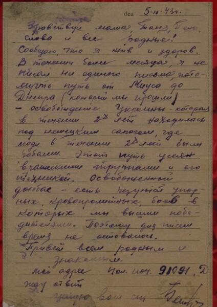 …В течение более месяца я не писал ни единого письма, потому что путь от Миуса до Днепра, который мы прошли — освобождение Украины, которая в течение 2 лет находилась под немецким сапогом, где люди в течение 2 лет были рабами, этот путь усеян вражескими трупами и его техникой. Освобожденный Донбасс есть результат упорных, кровопролитных боев, в которых мы вышли победителями. Поэтому для писем времени не оставалось…