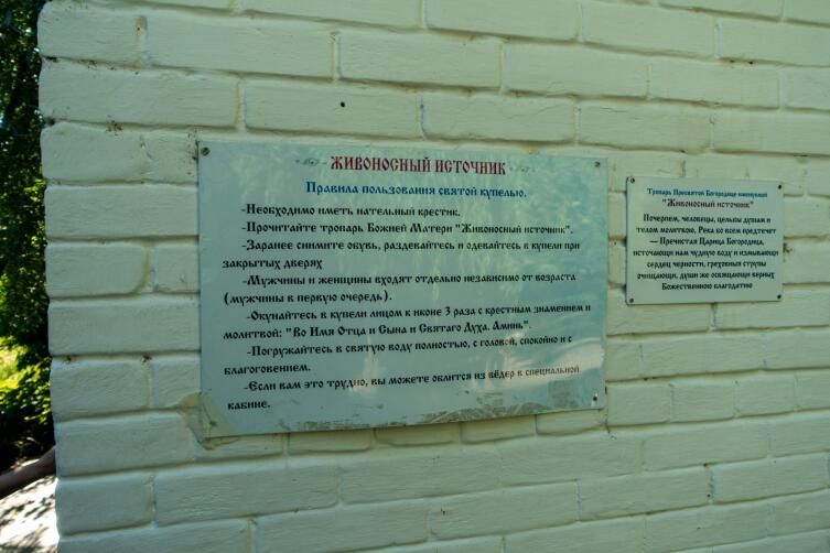 Устроено здание часовни с двумя раздельными купелями — монастырской и мирской. Вход в мирскую купель с благословения монастырской дежурной сестры у входа в монастырь: