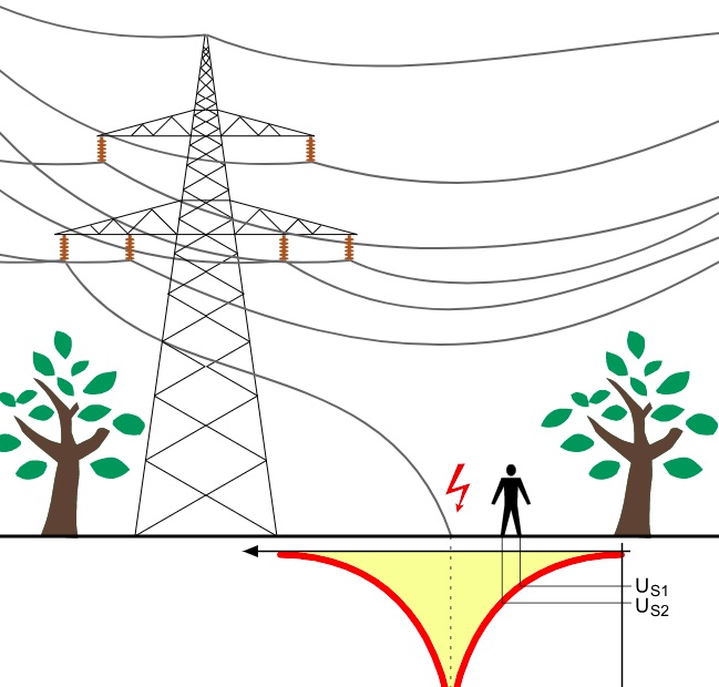 Шаговое напряжение — разница потенциалов между разными точками поверхности, по которой напряжение как бы «разливается». Чем шире шаг, тем дальше окажутся одна от другой стопы, тем больше разность потенциалов между ними и выше протекающий через тело ток. Если человек падает — он контактирует с почвой руками, и ток течет уже по пути «рука-нога», через сердце…