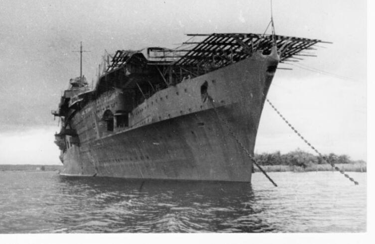К 1943 году, когда авианосец был готов на 95% (на нем стояли орудия, были смонтированы подъемники и даже закончена отделка кают), Гитлер, разочарованный провалом надводных сил в «Новогоднем бою», приказал остановить все работы. Гросс-адмирал Редер подал в отставку, а «Цеппелин» превратился в плавучий склад зерна в тихом порту Штеттина.