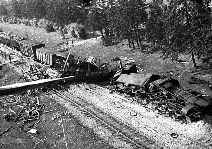 Сошедший с рельсов эшелон с техникой, 1942 г. Фото: Fortepan — ID 73963, общественное достояние