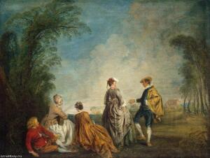Среди множества картин и рисунков Антуана Ватто (французский живописец, 1684−1721 гг.) есть несколько картин, как бы образующих серию. Это «Любовная гамма», «Полная гармония», «Затруднительное предложение» и «Remedy». На этих картинах от пяти до восьми персонажей. Где-то явно обозначены пары, где-то пара только намечается…
