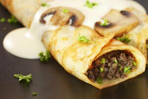 Иногда хозяйке хочется приготовить что-нибудь особенное. Какую-нибудь вкуснятину, чтобы удивить и порадовать своих близких, но не очень сложную в приготовлении. Предлагаю рецепт блинчиков с сыром и грибами, свёрнутых мешочком, с белым соусом. Надеюсь, что всем они придутся по вкусу.