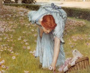 Миловидная, насколько можно видеть ее лицо, рыжеволосая женщина рвет цветы. Невозможно точно сказать, сколько времени она провела за этим занятием, но корзина полна цветов. Место действия ясно из названия — вилла Боргезе, Рим.