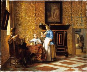 Питер де Хох (1629−1684) — голландский художник, жанрист. Его сценки кажутся бесстрастными, хотя за внешним спокойствием угадывается драма. Как правило, в них нет и намека на проповедь безгрешной жизни: мужчины, женщины,