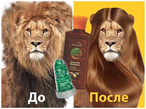 А вот еще пример из числа российских. Торговому центру потребовалось увеличить продажи шампуней. Изюминку нашли в том, что с помощью фотошопа «надели» на льва пышную гриву. Дескать, вот что делает шампунь такой-то марки даже с волосами льва!