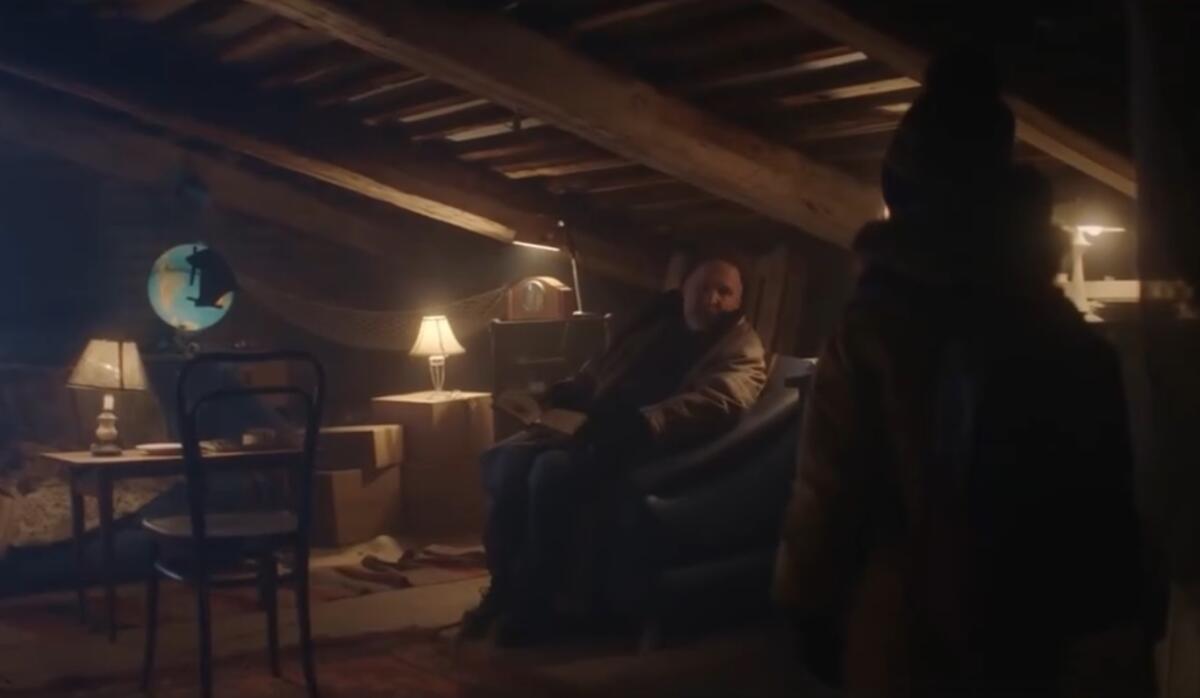 А те, что убежали, мелком рисуют стрелочки. На асфальте, стене дома, водосточной трубе: «Вот туда. Туда мы побежали. Найди нас!» И вдруг… В кадре появляется рука в перчатке, узнаваемая по её цвету и обрезанным кончикам пальцев. Рука Ивана Петровича. Которая стирает нарисованную малышней стрелку. И рисует свою, уже в противоположном направлении. И рисует стрелочки дальше. На асфальте, стене дома, подъезда: «Вот сюда. Сюда. И… Ко мне. На чердак».