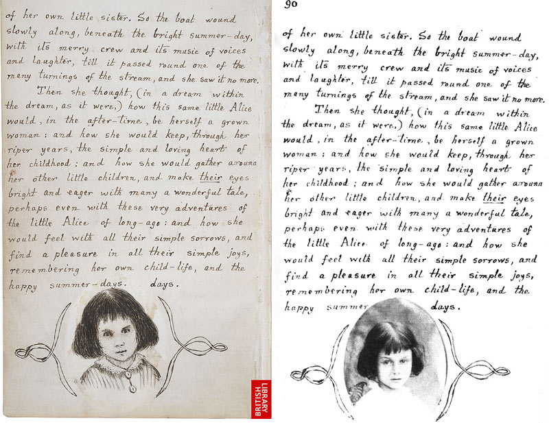 Но даже судя по этому скромному описанию, героиня книги не похожа Алису Лидделл. Достаточно взглянуть на её фото, которое Кэрролл вклеил внизу последней страницы своей рукописи (кстати, сначала на этом месте был рисунок автора, тоже изображающий его маленькую подружку). Мы увидим девочку с серьёзным взглядом, тёмными волосами и причёской в стиле «каре» с чёлкой.