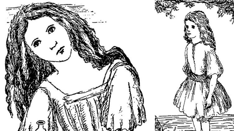 Если мы посмотрим на любительские рисунки самого Льюиса Кэрролла в рукописи, то увидим, что платье его героини более свободное, напоминающее перепоясанную тунику. Также мы увидим, что писатель не особо старался соблюсти точность — форма воротника и длина рукавов у него от рисунка к рисунку меняются.