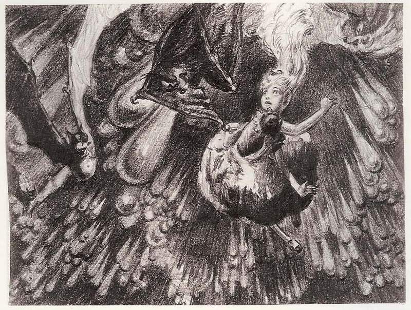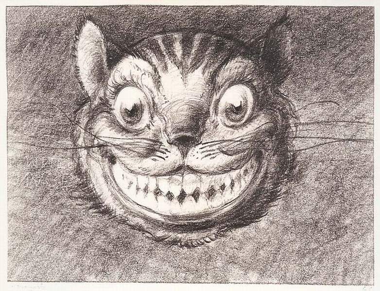 Вот Алиса падает в кроличью нору, полную свирепых летучих мышей. Вот Шляпник и Мартовский Заяц кидаются на девочку с ножницами и ножом. Вот Чеширский кот, от улыбки которого бросает в дрожь. Однако больше всего удивляет рисунок, где Алисе (по приказу Красной Королевы) собираются… отсечь голову на гильотине. Нетрудно догадаться, что сценарий 1939 года был куда более вольным, чем тот, что напишут впоследствии…