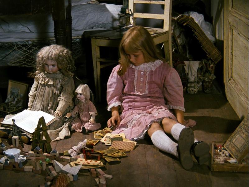Если не считать поросёнка и старшую сестру (мы даже не видим лица последней), то Алёнка — единственный живой персонаж в фильме. А окружающая её Страна чудес — целиком искусственный мир, населённый куклами, чучелами и рукотворными предметами. Более того — героиня сама периодически перевоплощается в куклу (когда пьёт уменьшительный напиток) или даже оказывается внутри куклы, как бабочка внутри кокона.