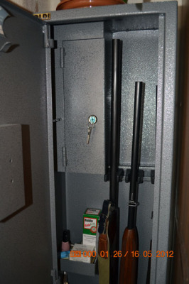 Здесь ружейный сейф с ячейкой для боеприпаса. В ней я храню документы и припас для травматики.