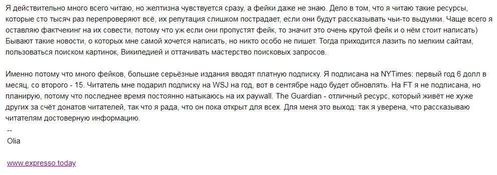 Есть еще один способ уберечься от лживых новостей — платная подписка на проверенные издания. Его мне подсказала Оля Морозова из рассылки Expresso. Приведу ее слова: